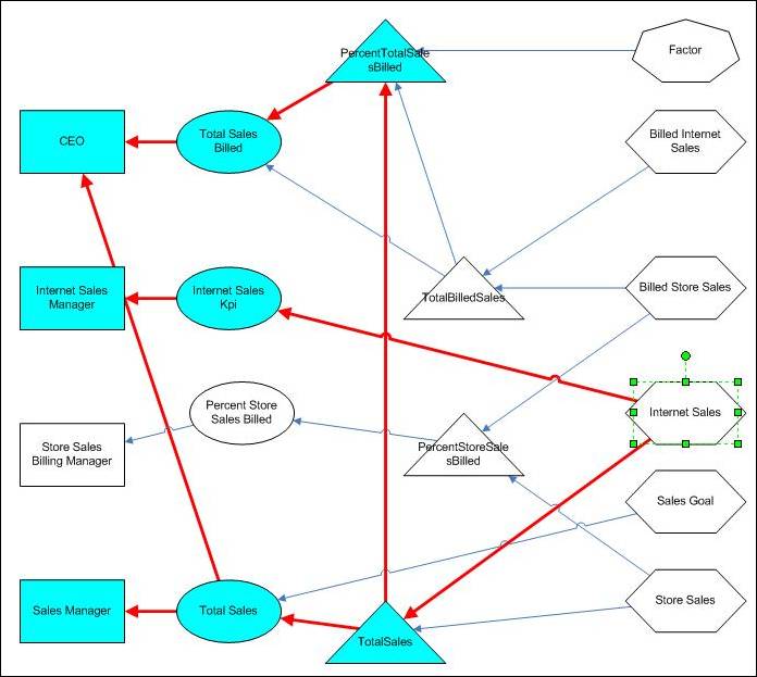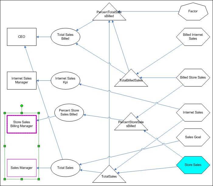 Figure 1 shows a sample of the Visio graph illustrating the Sales Manager and Store Sales Billing Manager are concerned with KPIs (Total Sales and Percent Store Sales Billed, respectively) that share a common measure: Store Sales (the hexagon highlighted in cyan). Such a common interest presents a potential for a conflict of interests. If the Sales Manager needed to drastically increase sales for some reason, she would know that the Store Sales Billing Manager would be affected because they are concerned with KPIs that are formulated with a common measure.