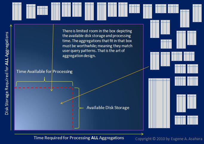 Figure 2 graphically illustrates the constraints of time and disk space when developing an effective aggregation design. For a given cube, there are a large number of possible aggregations – which consists of a set of tabular data objects each consisting of a unique combination of dimension attributes. However, there is only so much time to process them and so much disk space available to store them. Given those constraints, we can only create a subset of the possible aggregations, therefore, what we do create must count (must support the query patterns of the users).