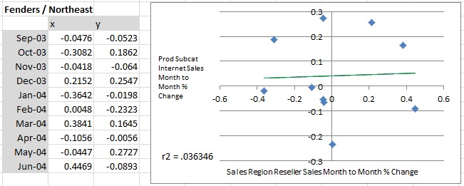 Now that we see all the calculations involved, let’s look at the highlighted cells from F1. The cell highlighted in red shows the correlation between the Reseller Sales amount in the Northeast and the Internet Sales amount for Fenders. The correlation of .036346, which is close to 0 suggests there is no correlation. F5 shows both a table for the respective x and y measures’ month to month percentage change for this cell as well as a graph plotting the xy pairs: