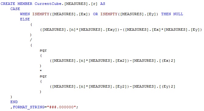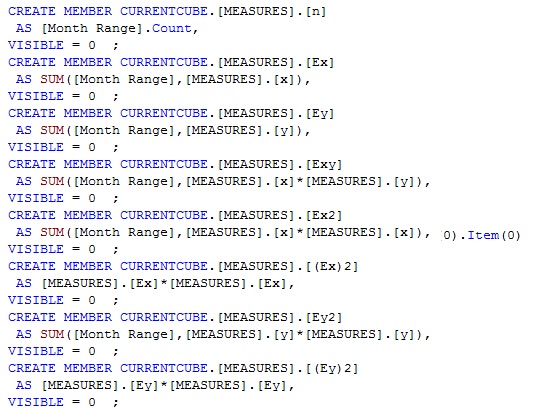 Actually, it’s not nearly as ugly as it looks. In fact, the OLAP user doesn’t need to worry about it at all since MDX has a CORRELATION function that makes this easy. The view shown in F1 can be implemented with a calculated measure such as this one (and a couple of supporting objects):
