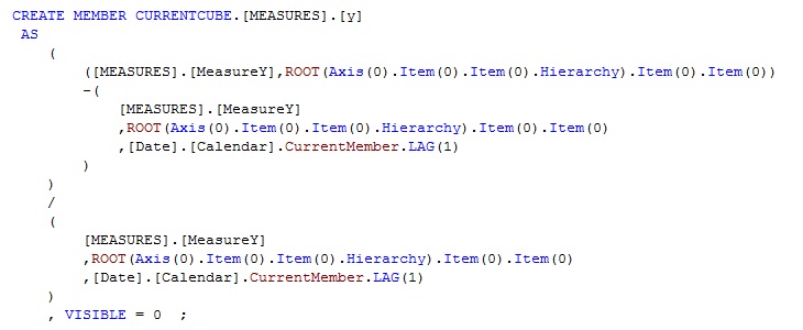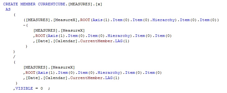 Although the syntax used in F2 is intended for the MDX script, the objects can be overridden using a different range of months or xy measures in the session (CREATE SESSION MEMBER) or query scope (WITH). However, I’ve actually made [x] and [y] a little more complex. I’m not correlating the raw measure values. I’ve actually implemented [x] and [y] to be the percentage change from the previous month as F3 shows for the [x] measure:
