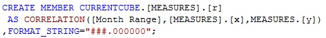 [MEASURES].[x] and [MEASURES].[y] could be any measure that we wish to correlate. In the example shown in F1, as I’ve mentioned, I’m correlating the Reseller Sales Amount for each sales region to the Internet Sales Amount for each product subcategory. The CORRELATE function “plots” the two values for a range of months, specified by the named set [Month Range]. F2 shows the MDX for the supporting elements in the above CORRELATION sample: