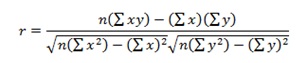 That measure, called the Pearson product-moment correlation coefficient, is a value from -1 through +1 that denotes the strength of a relationship. Values towards -1 indicates a strong inverse correlation, around 0, no correlation, and towards +1, strong direct correlation. The value is calculated using this ugly thing:
