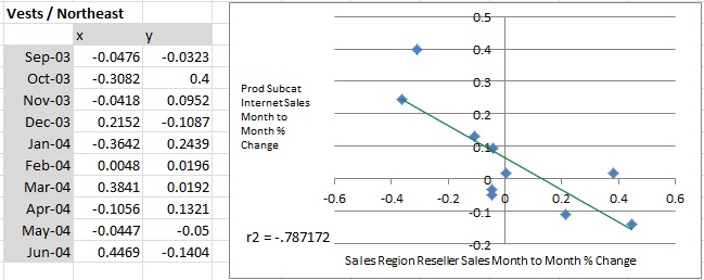 Notice the line points downwards. This means that when the Internet sales for Vests goes up, the Reseller sales for the Northeast goes down, and vice-versa. These relationships can be much more interesting than the ones where the trend lines goes up, sort of like a lever.