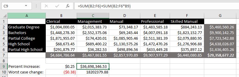 - We’re able to perform operations (additions in this case) in all vertical and horizontal lines. The total for each line is shown in the gray boxes.