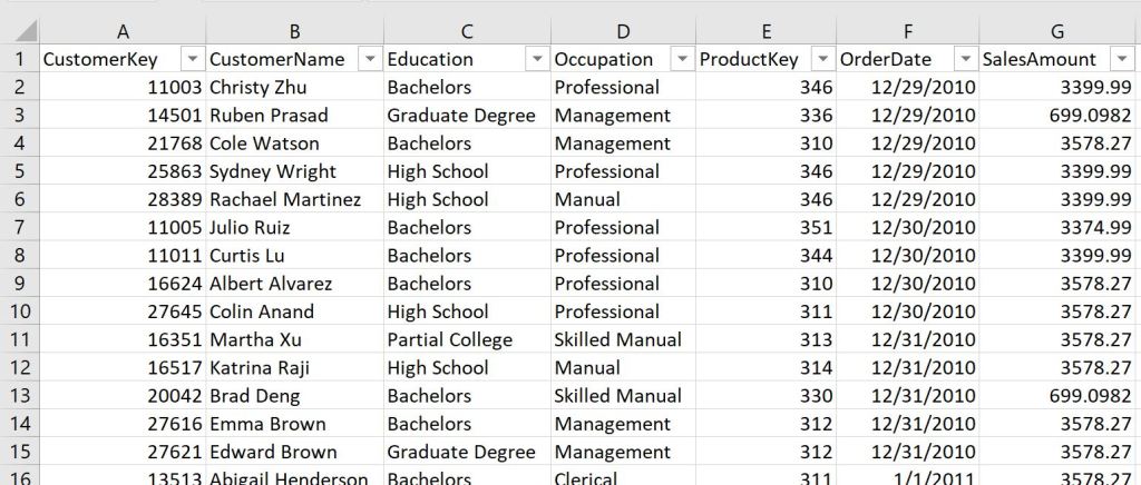 In contrast to Figure 2 above, Figure 3 shows a genuinely 2-dimensional matrix of sales along two axes of customer Occupation and Education. Both Figures 2 and 3 convey the same data and are displayed in Excel.