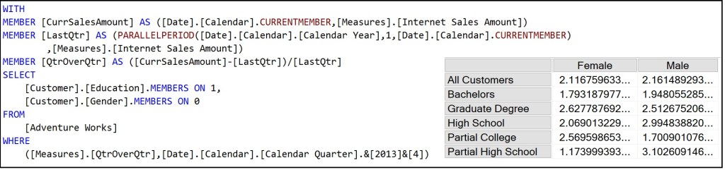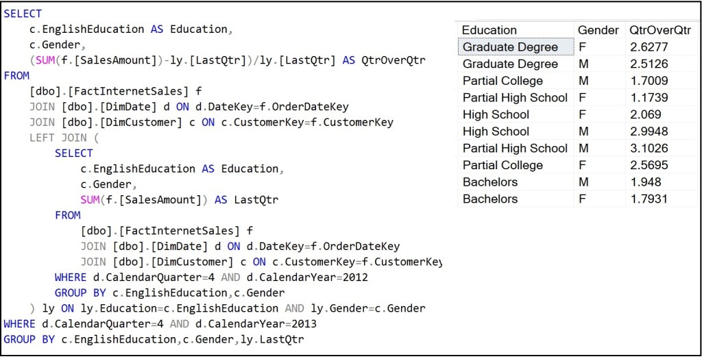 The SQL shown below in Figure 5 returns the percentage change from Q4-2012 to Q4-2013 for each Education level and Gender. It’s not quite as simple as a basic SQL query to merely retrieve the sales for Customer 2000: