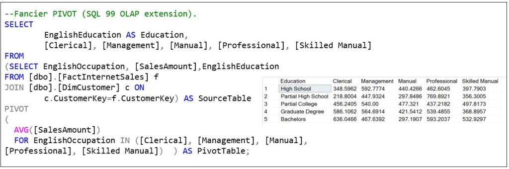 Figure 4b shows that SQL has become a true lingua franca in that it takes on characteristics from other languages. In this case, it’s the PIVOT function from the SQL-99 OLAP extensions. But those SQL extensions don’t address the underlying engine of a pre-aggregated OLAP. And, not all SQL dialects have implemented the SQL 99 OLAP Extensions.