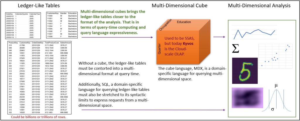 As illustrated in Figure 1, OLAP cubes in the tradition of SSAS and Kyvos SmartOLAP brings the data format and query semantics closer to the analytics. However, this value of pre-aggregated OLAP cubes is drowned out by the currently buzzword-inspiring capabilities of hardware and software. That is, the ability to successfully handle the transition of dauntingly massive volumes of data from ledger-like tables (CSV files, relational database tables, “one big tables”, etc) to matrix-like formats that are more conducive towards analysis.