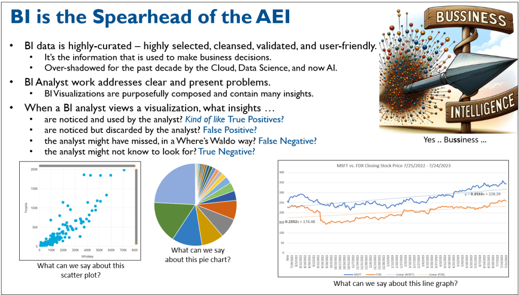Enterprise Intelligence is neither an AI Bandwagon nor AI Skeptic book. My book is from a BI Architect’s middle-ground point of view – how to combine the best tools into something with the potential to provide value that’s better than the sum of its parts. My book is a culmination of twenty years of hair-pulling experience applying “AI” (at least attempting to) to BI analytics processes.