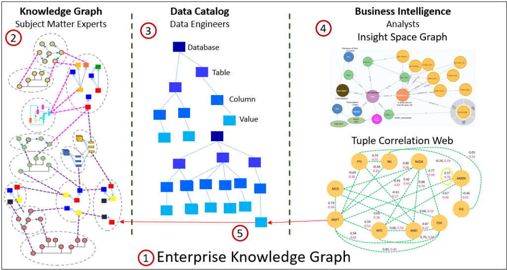 - Enterprise Knowledge Graph – The EKG serves as the integrated framework that links together the various components of an enterprise’s data and knowledge infrastructure. It forms the backbone of the system, ensuring seamless connectivity and coherence between different data sources and analytical tools.