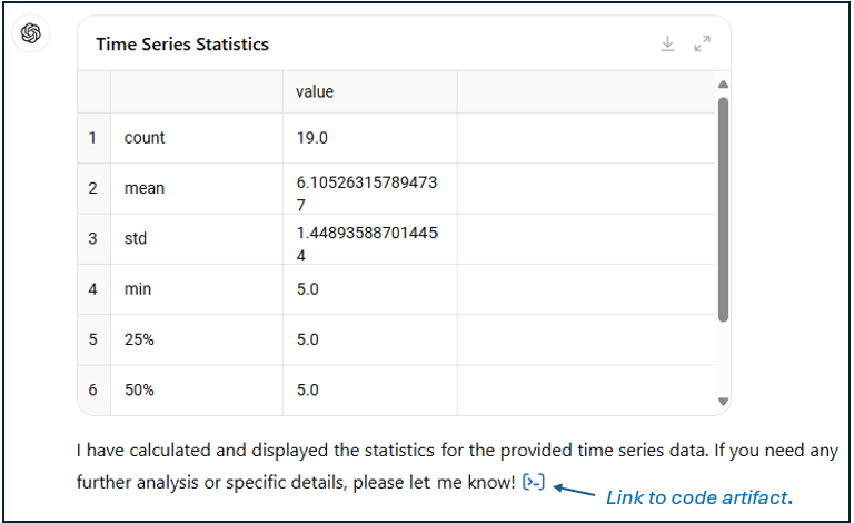 If providing standard statistics is something I will do very often, it would be smart of me to use the concise Python artifact ChatGPT created rather than to ask ChatGPT each time – whereby it computes from scratch. It will save on the OpenAI bill and ensure the calculation is performed the same way each time (should ChatGPT decide to do something else). I believe at the time of writing, OpenAI is thinking about caching mechanisms – one of which could be caching these artifacts.