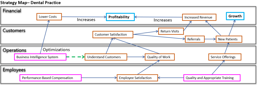 Each node of the strategy map is an element of the strategy. For example, increasing referrals is a strategic aspect intended to grow the practice. There are many ways to increase referrals, but those ways are tactics we can apply, for example, ensuring our patients are delighted with the care they received.