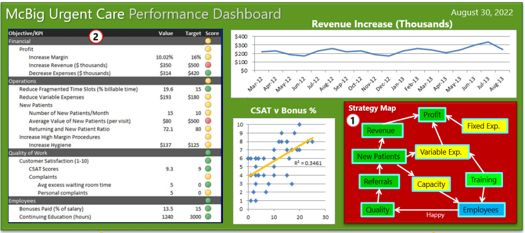 On the lower-right corner of Figure 1 is an example of a strategy map embedded into a dashboard (1). In that rather static and simplistic state, it’s not living up to its full potential as our enterprise’s theory of mind.