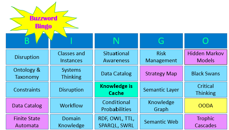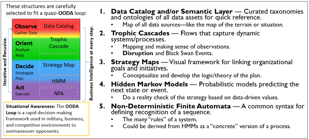 Figure 4 shows five knowledge structures I’m discussing in this blog. The five knowledge structures weren’t chosen at random. They align with the OODA phases—in some cases overlapping two phases (which is why there are five knowledge structures, but only four OODA phases).