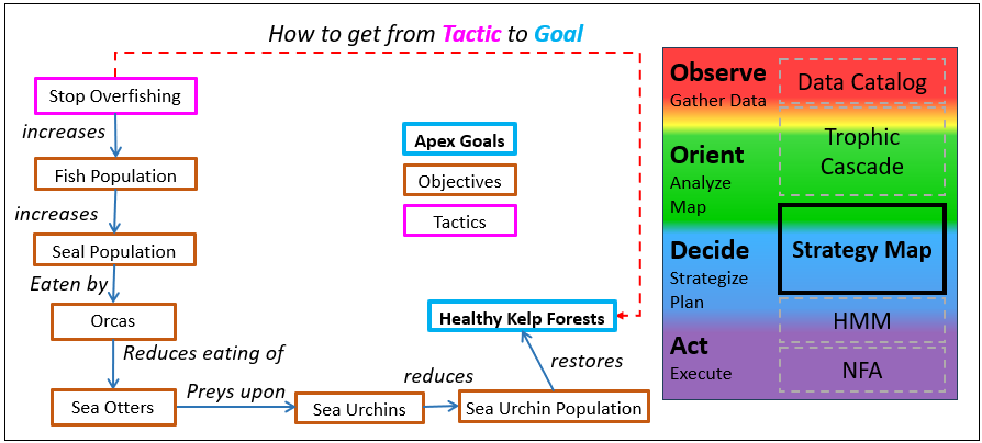 A similar process is applied to trophic cascades (map) transitioned to strategy maps (plan). A Markov model of an ecosystem captures how species interact based on observed data. A trophic cascade map structures those interactions into meaningful relationships. A strategy map then refines this further into decision-making guidelines. Finally, these strategies become tactical rules, just as an NFA distills valid transitions from a Markov model.