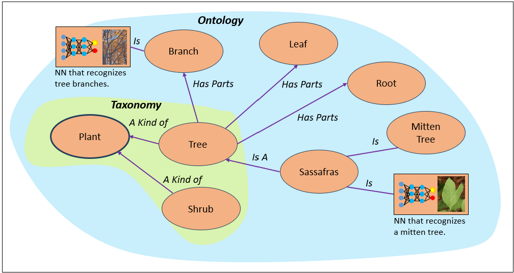 Figure 1 shows a very basic (and incomplete) taxonomy and ontology. The taxonomy is in the green field, a snippet stating that trees and shrubs are a kind of plant. The taxonomy is embedded within a wider ontology adding examples of the parts of a tree and one type of tree (Sassafras).