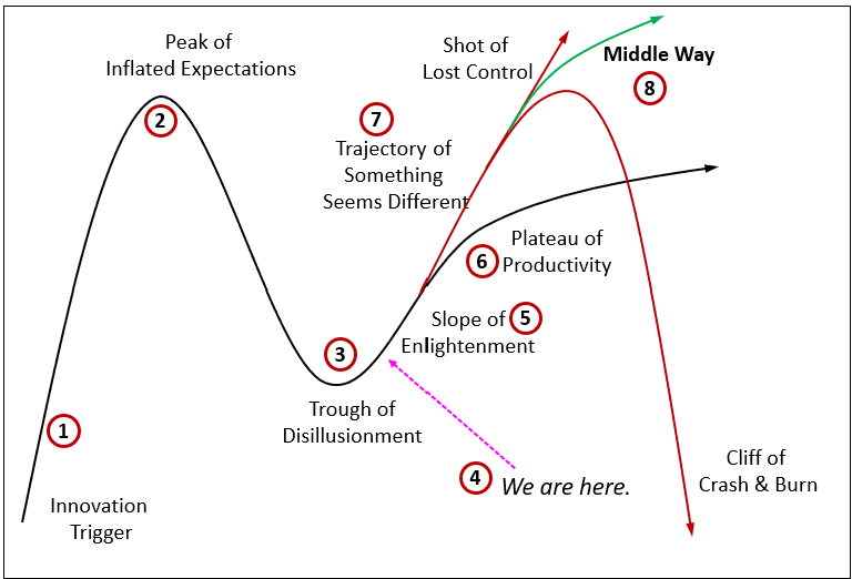 Figure 1 is a modified Gartner Hype Cycle. The black line represents the typical path. But this round of AI is far from typical. I imagine we’d like to avoid “The Borg” or “The Matrix” outcomes (Shot of Lost Control) as well as the SkyNet outcome (Cliff of Crash & Burn).