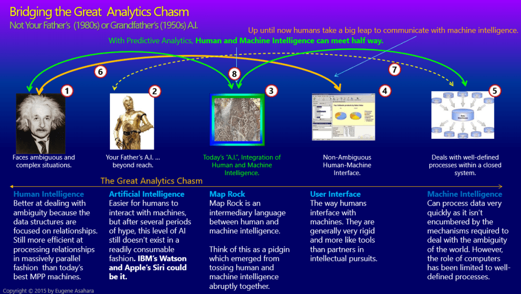 Figure 2 is an old slide of mine I haven’t seen since 2015. It’s from a Map Rock presentation (sorry for the ca. 2010s dark background and how busy it is—click on it to see it in full form) illustrating the big chasm between human intelligence and machine intelligence that can be reduced through an intermediary pidgin.