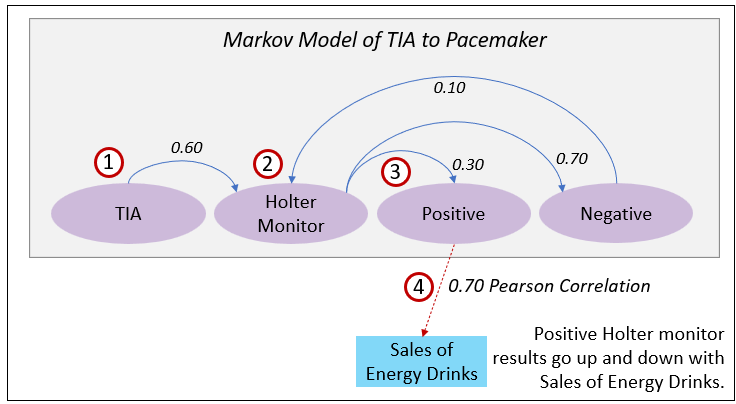 - This is a conditional probability from Positive event of a Holter Monitor result to an event completely unrelated to the data from which the Holter monitor Markov model was created and not obviously related. That is, Sales of Energy Drinks.