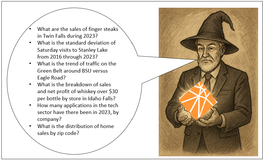 2015 was a long time ago. Why didn’t anything become of this? Well, back then there wasn’t AI as we know it today. The presentation was about creating a knowledge graph extended to include BI-derived information and embedded machine learning models (sometimes lumped in with AI). The presentation was delivered at a MeetUp of the “Boise BI User Group” (hosted by the Boise Microsoft office) on October 8, 2015, titled, “The Immense Potential for Large Scale Graphs in a Business Intelligence Environment“.