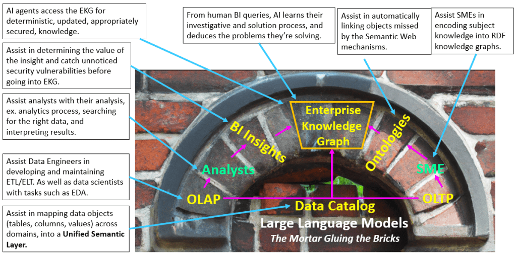 In a nutshell, we build an infrastructure for developing and maintaining an extended knowledge graph, an organization of enterprise-wide knowledge, as self-maintaining as possible. AI plays the role of a fantastically versatile mortar/glue between the pieces—as versatile as Duct Tape.