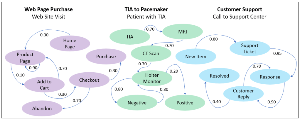 Figure 6 shows a few examples for Markov models for three different processes—Web Site Visit, Patient presenting with a Transient Ischemic Attack (TIA), and Support Center Calls.