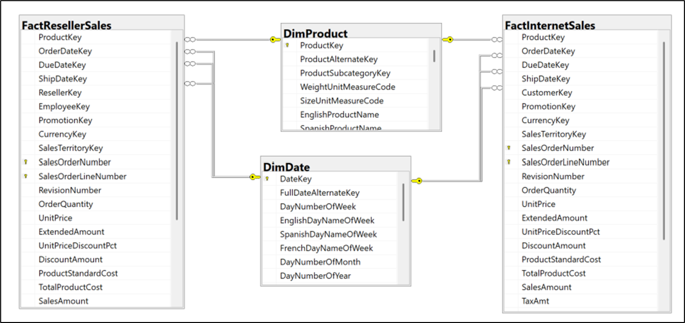 Note that FactResellerSales has an EmployeeKey but not FactInternetSales. Conversely, FactInternetSales has a CustomerKey but not FactResellerSales. This reflects the B2B and B2C nature of the FactResellerSales and FactInternetSales tables, respectively.