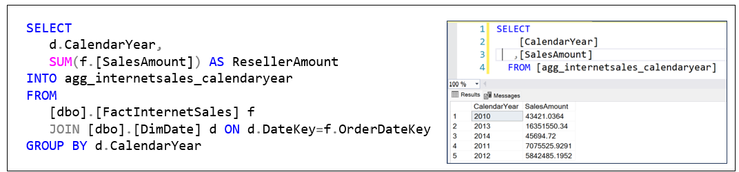 Figure 3 shows how we can save the SalesAmount totals by year into a table named agg_internetsales_calendaryear. The left is the SQL we’ll use. The right is the contents of the aggregate we just created.