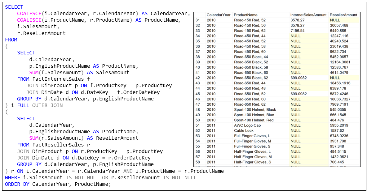 As mentioned, the “unit” question of OLAP is the slice and dice query. I call it the “unit” query because these slice and dice queries can be composed into more sophisticated, “higher-order” queries. For example, Figure 5 shows a SQL comparing the internet sales amount and reseller sales amount by year and product.