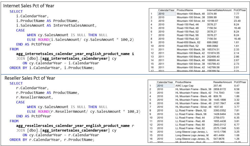 The SQL query in the upper part of Figure 9 computes the percentage contribution of each product’s Internet sales to the calendar year’s total internet sales using already-aggregated data. While this specific output is useful for reporting or display—especially when formatted as a clean table showing PctOfYear—it is a point-in-time derivation. The result cannot be reused in other queries without repeating the logic or persisting the result somewhere, such as in a table or view.