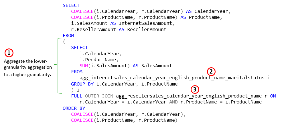 With that aggregation, we can derive the same values of the higher granularity aggregation: The sum of the marital status rows for each product equals the total for the product. Figure 10 below show what that SQL looks like: