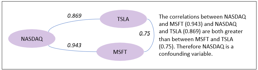 The confounding variable is NASDAQ. See in Figure 4 how the correlations between NASDAQ and MSFT (0.943) and NASDAQ and TSLA (0.869) are both greater than between MSFT and TSLA (0.75).