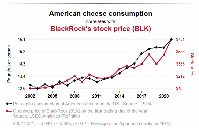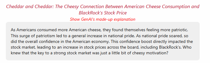 What’s even more interesting on the Spurious Correlations site is the AI-generated explanation he includes for those ludicrous correlations. For example, this is the AI-generated explanation for one of the items on the site, “American cheese consumption vs BlackRock’s stock price (BLK): 0.883” (shown back in Figure 2b):