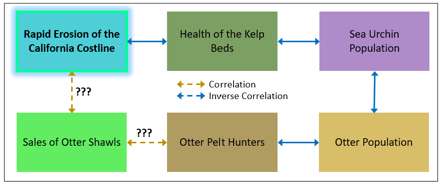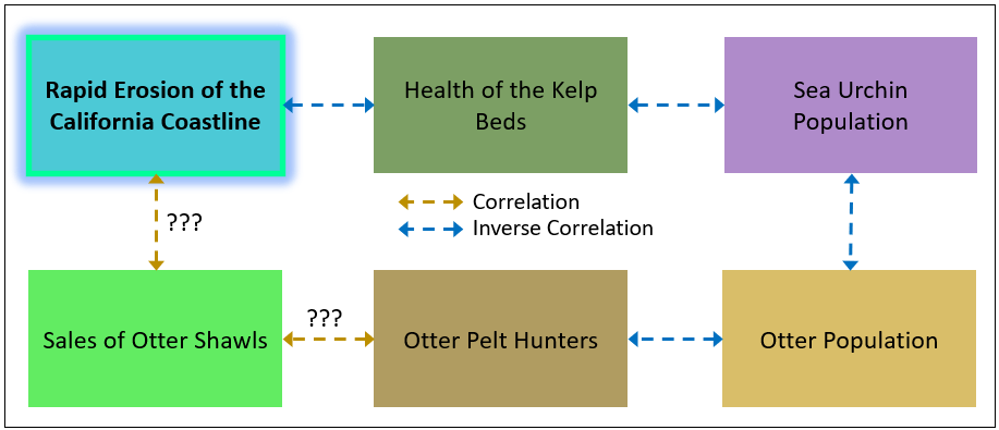 The first step is turning our gut reaction into a formal hypothesis: The population of sea otters is inversely correlated with the population of sea urchins.