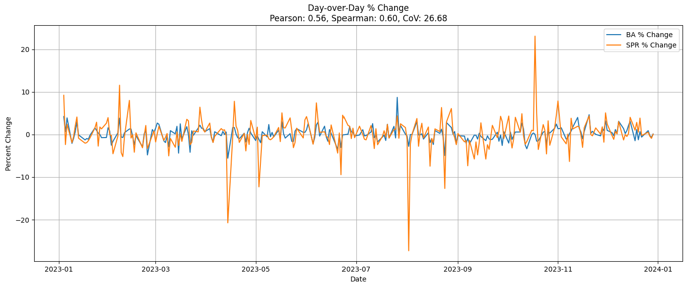 Conversely, Figure 9 is an example of two stocks that demonstrate a moderate correlation (0.56) using the Day over Day method (not the raw closing prices), BA (Boeing) and SPR (Spririt AeroSystems). They are codependent, therefore their fortunes tend to rise and fall together: