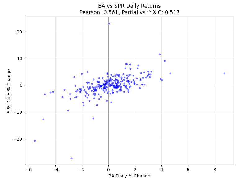 | BA | SPR | 0.56 | 0.41 | 0.26 | 0.52 | Spirit AeroSystems makes fuselage sections for Boeing; order cycles directly link performance. |