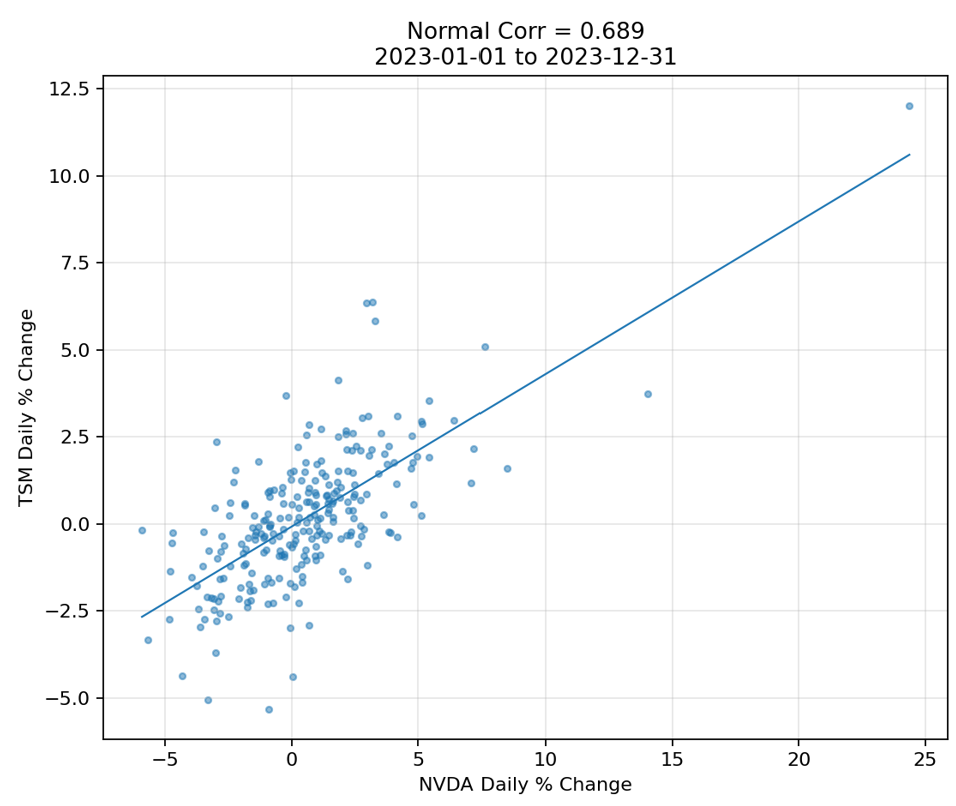 Both sides of Figure 11 are rather scattered. So you get a good idea of what a 0.318 correlation score looks like. No, I wouldn’t bet my farm on it. Personally, I would pay no attention to anything under 0.70. Figure 12 shows the NVDA and TSM correlation of 0.689. Despite the outlier, that score does have the semblance of a relationship.