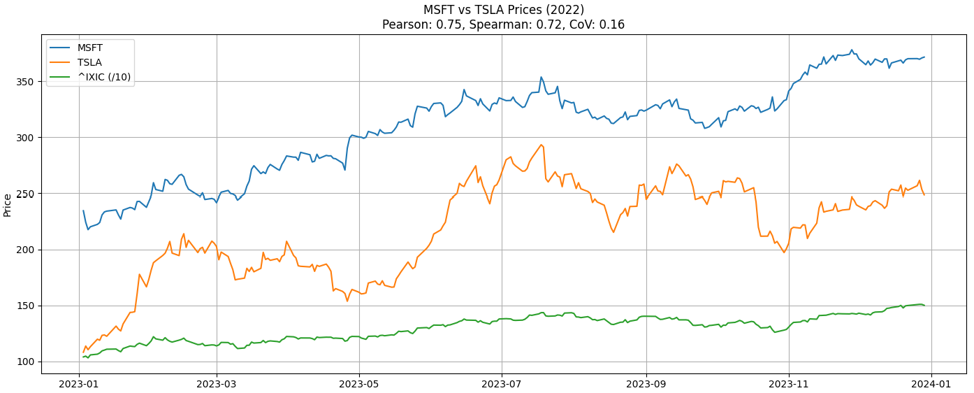 Figure 3 shows the daily closing stock price of MSFT (blue), TSLA (orange), and NASDAQ (green, and scaled /100). Aside from being large high-tech companies and more recently AI, MSFT and TSLA are very different—different markets, different products, different work cultures. The recent AI surge is reflected in the tech-heavy NASDAQ which shows at least 50% growth during the time period.