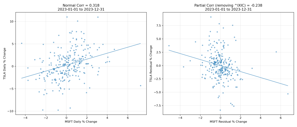 Figure 11 shows a graph comparing the normal correlation between daily percent changes of MSFT and TSLA (left) with a “partial correlation” after removing the effect of the NASDAQ index (right). The left panel suggests a moderate positive relationship (0.318), but once the index influence is removed, the relationship flips to an inverse relationship (-0.238)—showing that the apparent connection was largely an illusion created by their shared dependence on broader market movements.