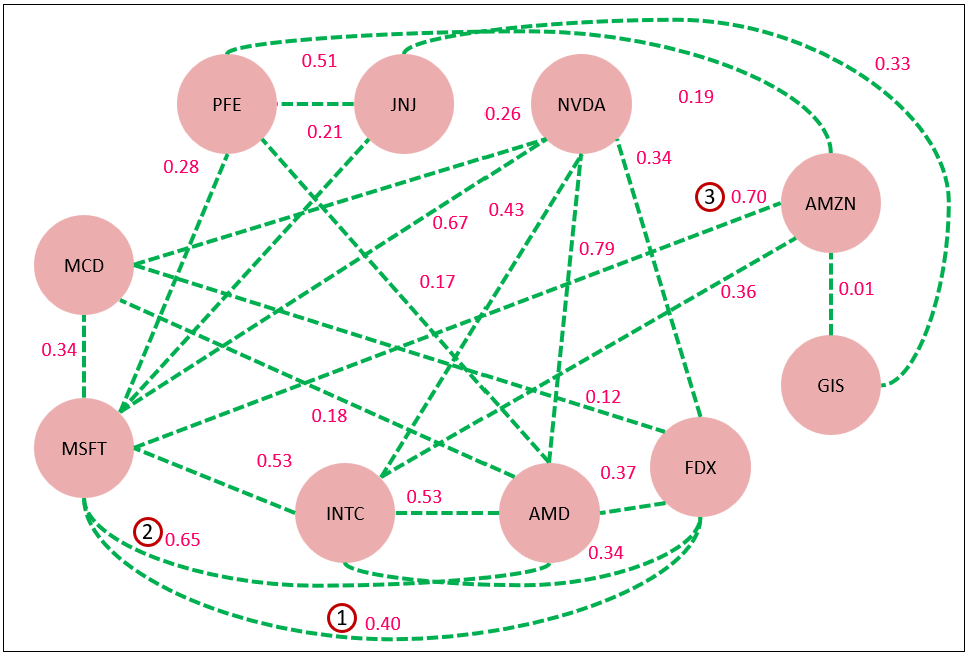 Figure 1 is a very simple example of part of a TCW. It is the Pearson correlation between the closing prices of selected stocks from July 25, 2022 through July 24, 2022. In other words, the measure of how closely the stock prices of each pair go up and down together. Let’s look at a couple of the relationships numbered in Figure 1:
