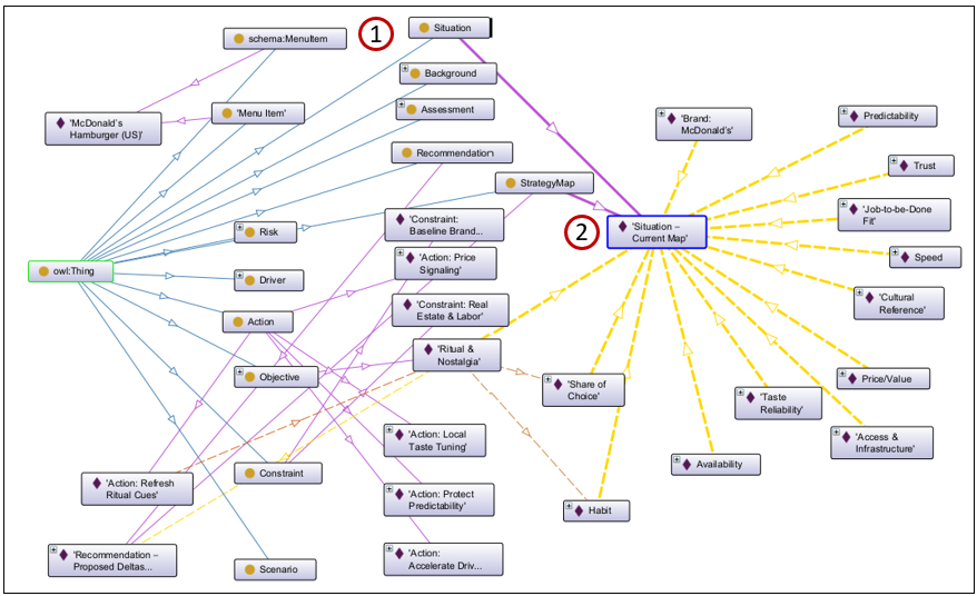 This RDF ontology describes a strategic analysis of the McDonald’s hamburger using the SBAR (Situation, Background, Assessment, Recommendation) framework and a strategy map. It explains why the baseline McDonald’s hamburger persists as a dominant product by modeling its success through a causal network of objectives, drivers, constraints, risks, and proposed actions.Key Components: