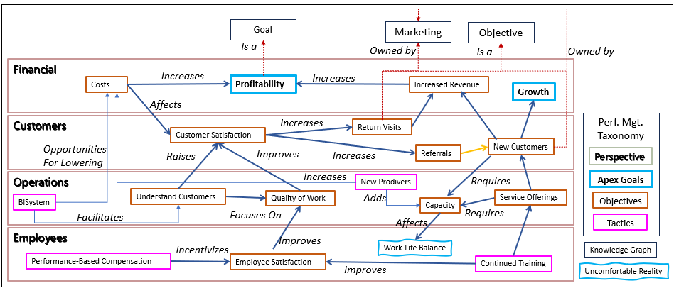 The RDF equivalent of this strategy map illustrated by Figure 1 is stored on the GitHub repository for this blog and can be viewed in an RDF tool such as Protege. I also discuss this strategy map in more detail in Chapter 10 of Enterprise Intelligence.