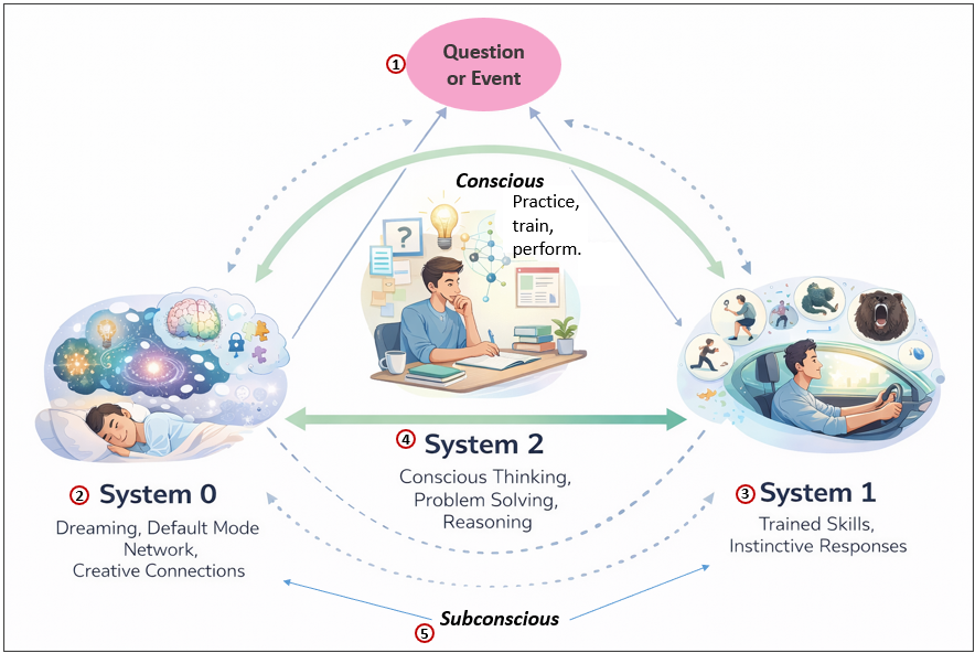 Figure 2 shows human intelligence as a continuous loop between three cooperating systems as opposed to a single “thinking engine”. A question or situation triggers conscious reasoning (System 2), which relies on both deeply practiced behaviors (System 1) and a constantly running background process (System 0). Over time, insights discovered through effortful reasoning and lived experience are consolidated into faster, more automatic responses, while System 0 continues to integrate experience into broader narratives that shape future understanding.