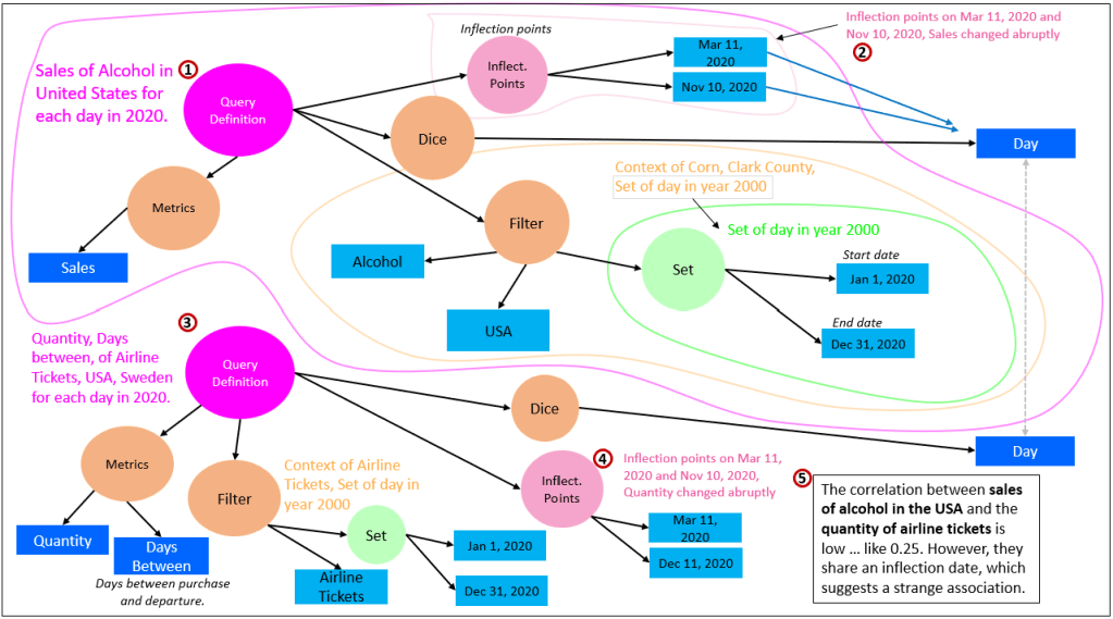 Now, let’s look at two more QueryDefs. Figure 8 illustrates how two seemingly unrelated analytical questions become connected through shared temporal structure rather than direct correlation. The first query (1) examines daily sales of alcohol in the United States during 2020, while the second query (3) analyzes the quantity of airline tickets and days between purchase and departure over the same period. At the metric level, these two datasets are weakly correlated—the overall correlation between alcohol sales and airline ticket quantity is low (5). If correlation were the only criterion, these queries would appear largely unrelated.