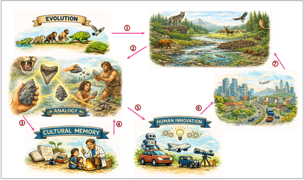 Figure 1 illustrates this process—from evolution to cultural memory to analogy-driven invention that is sourced mostly from our culture: