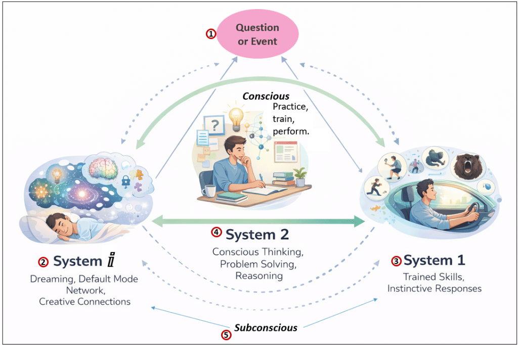 Of course I thought it. It came from my brain. But it came from a network that the conscious mind does not directly control. At the same time, our conscious choices—what we practice, what we attend to, what we expose ourselves to—shape that background network over time. In Kahneman’s framework, this corresponds to the fast, automatic, and largely subconscious System 1—a vast collection of learned functions that, after long training, allow us to drive a car while carrying on a conversation or play a musical piece without thinking about each note.