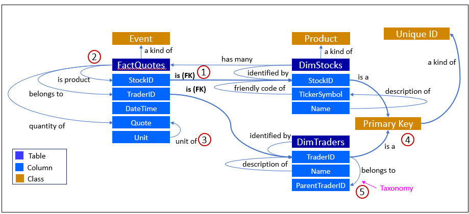 - Deeper semantics emerge beyond plain FKs: FactQuotes is classified as a kind of Event (②), quotes are associated with a unit of measurement (③), identifiers link to unique primary keys, DimTraders include a hierarchical ParentTraderID (⑤) forming a taxonomy of trader relationships, and overall structure ties products/stocks to events via classification and description arcs.