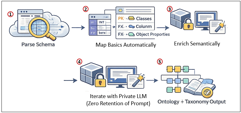 - Iterate with LLM assistance (private endpoint, zero-retention): Prompt for refinements like “Given this FK chain and column names, suggest OWL axioms for classification and measurement units.”