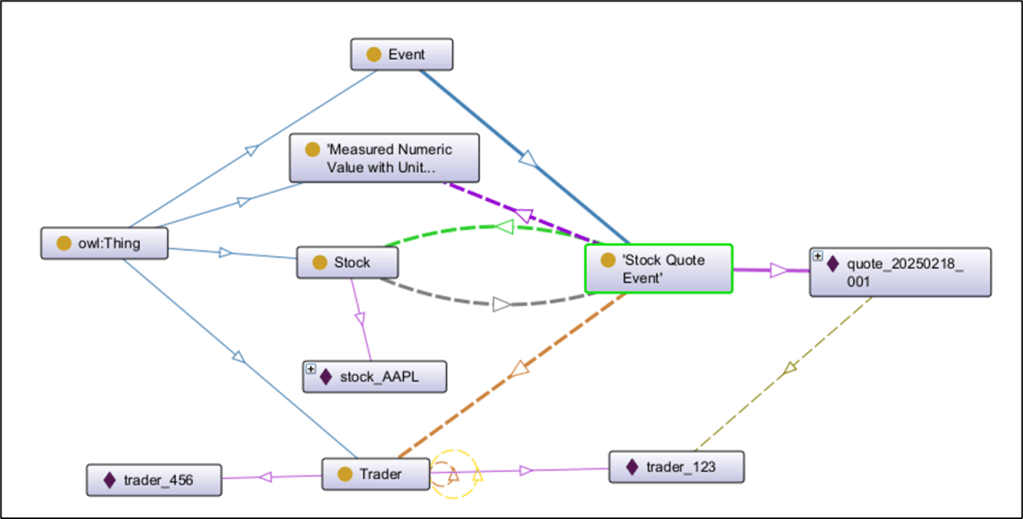 At first glance, this looks like “just” a database schema—optimized for queries, joins, and analytics. But it’s already an informal ontology, formed from the data modelers who created this schema. Tables act as classes (Event, Product/Stock, Trader); columns as properties (has Quote, identified by TickerSymbol); foreign keys as object properties (belongs to Trader, has many Quotes); and the ParentTraderID hints at inheritance or hierarchical classification.